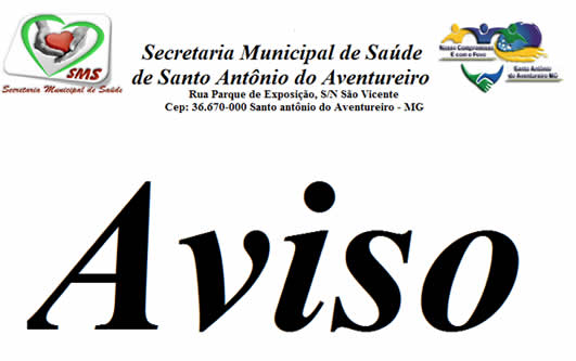 A SECRETARIA MUNICIPAL DE SAÚDE juntamente com o CONSELHO MUNICIPAL DE SAÚDE, vem por meio deste convidar a toda a população para a VIII CONFERÊNCIA MUNICIPAL DE SAÚDE DE SANTO ANTÔNIO DO AVENTUREIRO.